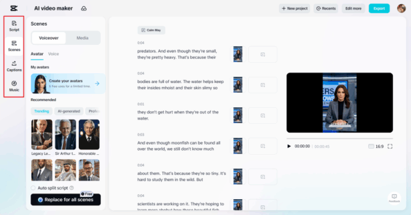 The ‘Scenes’ tool enables you to add AI-generated avatars or a personal voiceover. The “Voice” panel also gives you easy options to adjust tone and pace if you prefer an audio-only approach. Finish the atmosphere with stylish captions and explore the massive music library and background tracks from CapCut Web that will boost engagement.
