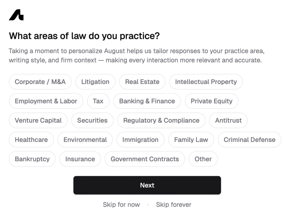 ‘I worked for an attorney in Alaska at a small firm where a tool like this would have been invaluable, but the barriers to entry were impossibly high. We built August to change that. Any lawyer can sign up right now and start getting work done immediately, with August Academy there to help them learn as they go.’