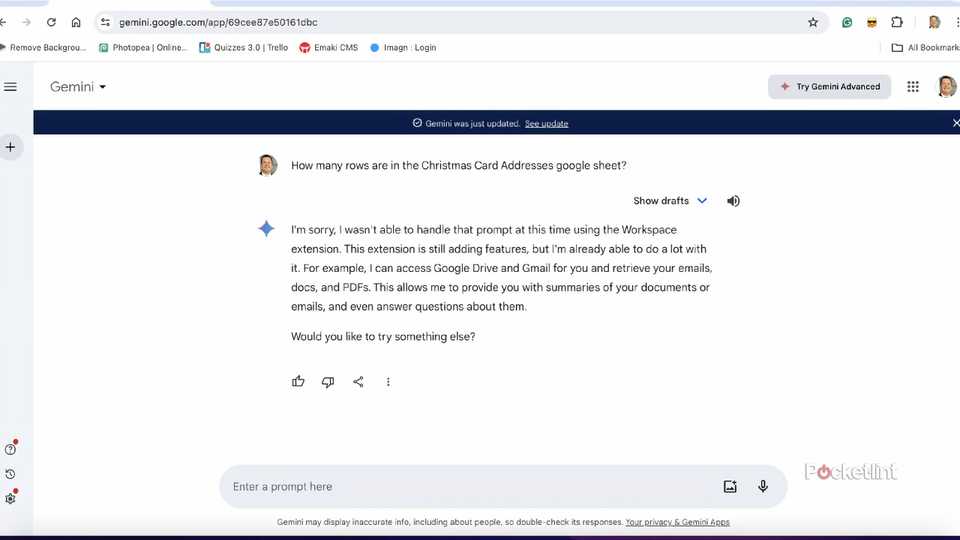 I continued to try out different prompts with Gemini, seeing what it could gather from my Google Docs. There are things that it can do for you when searching for Workspace files and things that it doesn’t quite have the capacity for yet. I asked it to open a saved resume I had in Google Docs, and it informed me that it was “not quite sure how to check Workplace Extension based on your prompt. It may help if you try restarting it.” I restarted it, asked again, and — unfortunately — received the same response.