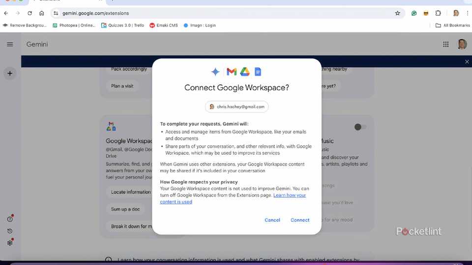 It’s nice that Google double-checks with you whether you want it to be able to see the contents of your Google Drive and Gmail accounts, which confirms that you’re certain you want it to have that kind of access. I used it with my personal email address because my work account is not enabled to use Gemini.
