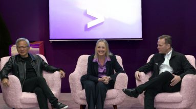 Left to right: Jensen Huang of Nvidia, Julie Sweet of Accenture and Rob Smith of KION discuss their … [+] partnership in physical AI for warehouse automation. Nvidia Though the…