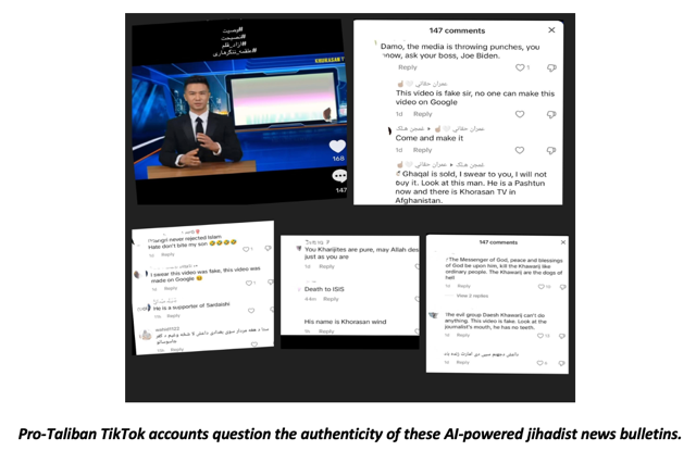Besides Twitter, these AI-news clips garnered substantial engagement on TikTok, with one such video amassing over 150 likes and comments predominantly sparking hostile reactions from Taliban sympathizers. Several pro-Taliban accounts swiftly criticized the AI-generated propaganda news clips, disparaging them as crudely edited and branding them as disinformation. They accused ISKP’s “media warriors” of appropriating the identity of a legitimate news network, Khorasan TV International, active in Afghanistan, to propagate extremist propaganda and falsehoods. One user commented, “The video is clearly fake and was made online! Look at the journalist’s mouth—he has no teeth. These extremists will do anything to spread lies.” On the other hand, pro-IS accounts praised the “innovative” style of propaganda broadcasting, noting the advantage of being able to circulate them “online without security concerns.”