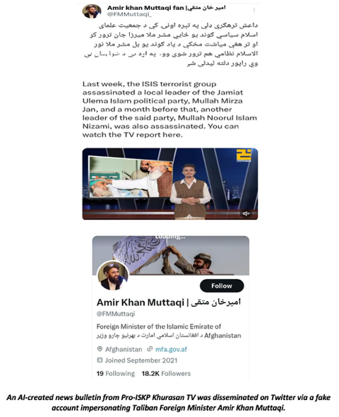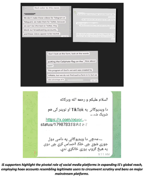 Primarily disseminating these AI-generated news reports on ISKP’s operations via encrypted platforms like Telegram and Rocket chat, ISKP adherents contended that this AI-driven content was intended for broader distribution on social media networks such as Twitter and Facebook. They believe these platforms hosting ” most socially active communities” offer unparalleled opportunities for disseminating propaganda, appealing to, and mobilizing more supporters despite the challenges of regular account suspensions and the accompanied content-sharing restrictions. Pro-IS users also suggested creating fake Twitter accounts that mimic the profiles of legitimate users, media outlets, and other religious or political figures to disseminate these AI-generated news videos.