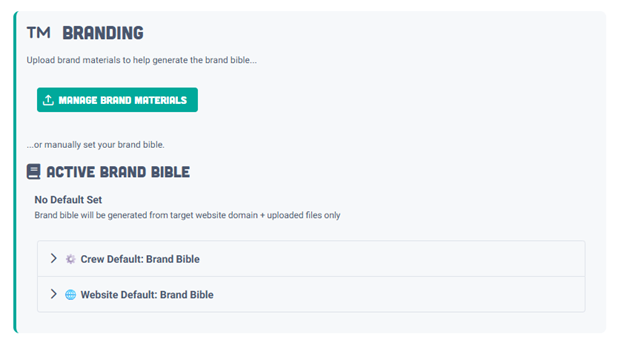| 0. Brand Bible | Upload your brand assets and site; Market Brew learns your tone, voice, and banned terms. | Every piece written in your unique brand style. |